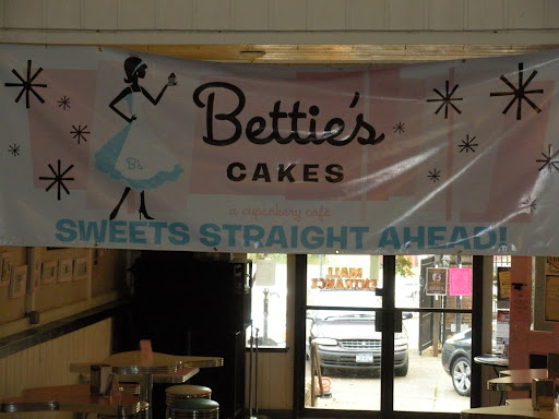 Woo! Hoo! Straight ahead. I loved that it was called a cupcakery cafe. How cute! Here we are – at Bettie’s yay! I thought it was so cute. The signs and the seating really had a cool retro feeling. If I had a cupcake shop…. this is what I would want it to look like!