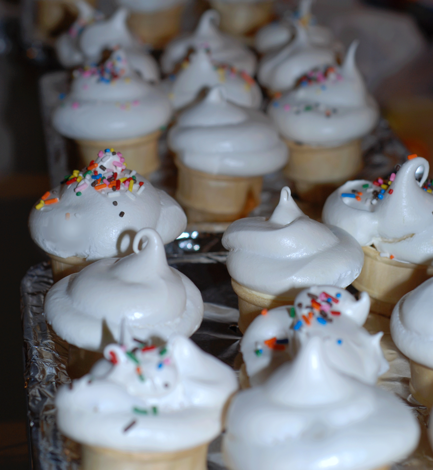 not get too mushy. The ice cream cones are filled with yellow cake and chocolate fudge pudding and were baked at 350 degrees. I then just took a little buttercream icing and used it to attach the meringue to the cone. I was amazed at how much they looked like ice cream cones. Personally, I liked the look more than the taste, but they seemed to go over pretty well at the party.