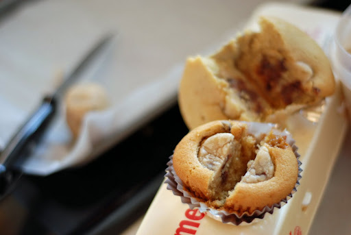 Here is the neat part! You just push one of the frozen tubes of dough right down into the center of the batter. After talking with Josh and looking at the first batch that came out of the oven, we decided that the dough was huge and that maybe I should cut each tube in half. So for the second set of 12 I did that.